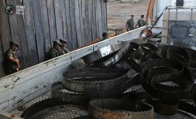 Бразильские солдаты стоят возле грузовика с конфискованными ленточными пилами в штате Пара, Бразилия.