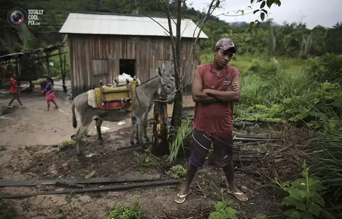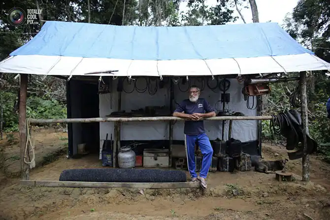 Мужчина стоит возле своей хижины рядом с шахтой в дождевых лесах Амазонии недалеко от города Мораис Альмейда.