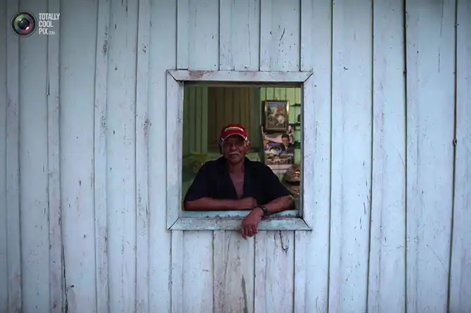 Мужчина стоит возле своего дома в дождевых лесах Амазонии недалеко от города Уруара.