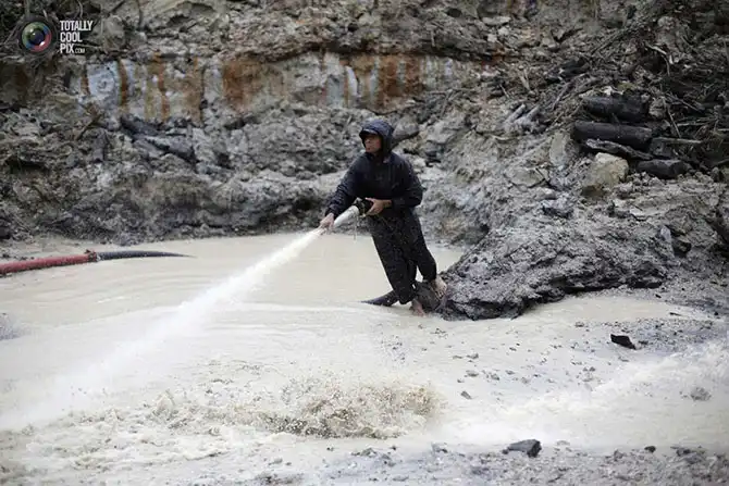 Работа на нелегальной шахте по добыче золота на вырубленном участке дождевых лесов недалеко от города Мораис Альмейда.