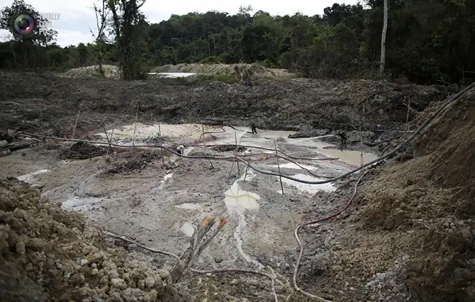 Люди работают на нелегальной шахте по добыче золота на вырубленном участке дождевых лесов.