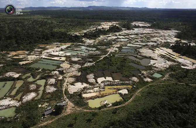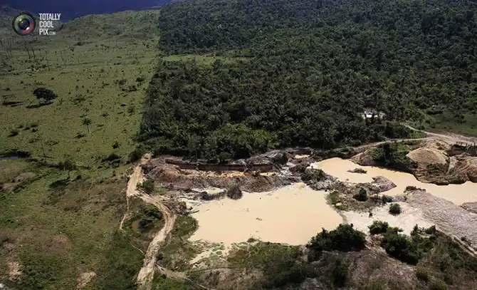 Нелегальная шахта по добыче золота на вырубленном участке дождевых лесов недалеко от Кастело дос Сонос, штат Пара, Бразилия.