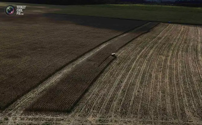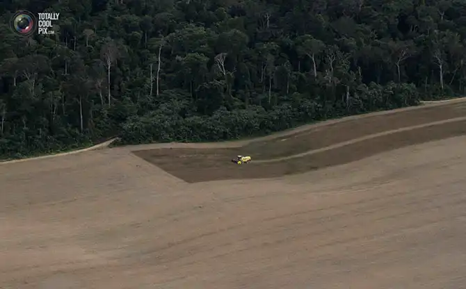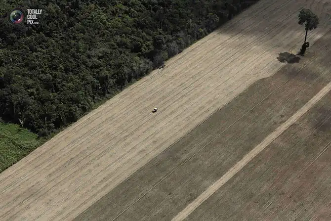 Трактор едет по пшеничному полю, на месте которого раньше росли девственные дождевые леса.