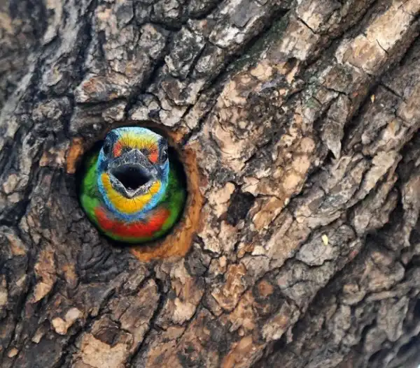 Азиатский дятел чернобровый бородач охраняет свое гнездо. Тайбэй, Тайвань