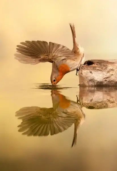 Рыжая птичка Пети пьет воду в озере. Фотограф: Cesar Pastor Quesada