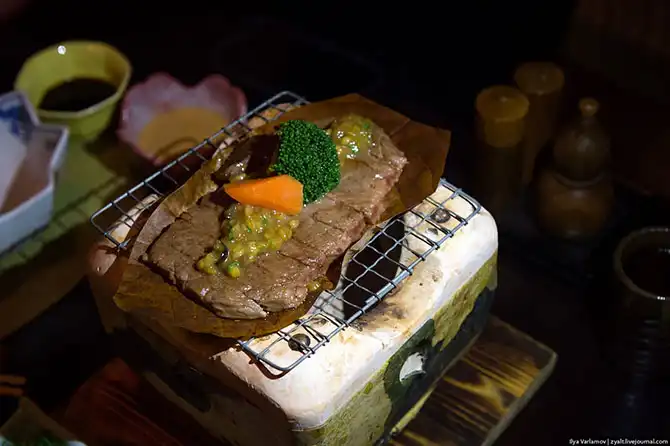 Ну и как основное блюдо – стейк из мраморной говядины, приготовленный на каком-то листике хитром (houba).