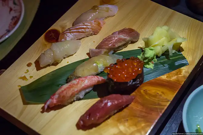 И суши. Обратите внимание, прямо над суши с красной икрой – жирный тунец. Жирный тунец очень вкусный и нежный, но в Москве его почему-то почти невозможно найти в японских ресторанах. Жалко.