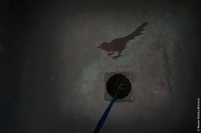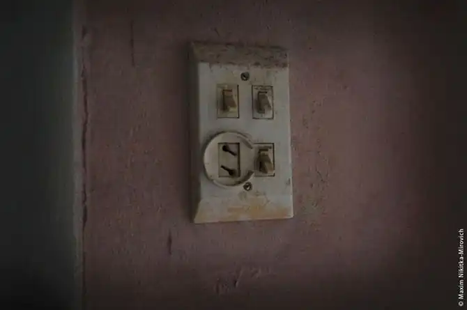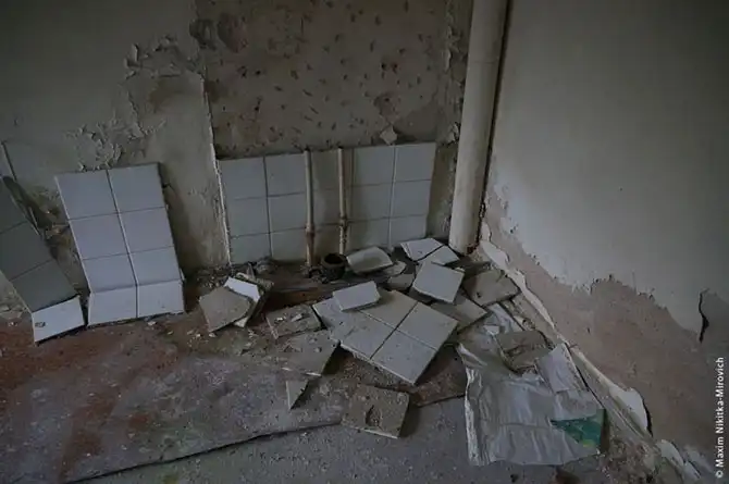 Битая плитка в углу. Судя по коммуникациям, когда-то здесь стояла раковина с горячей и холодной водой.