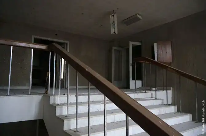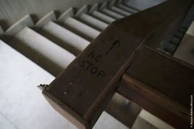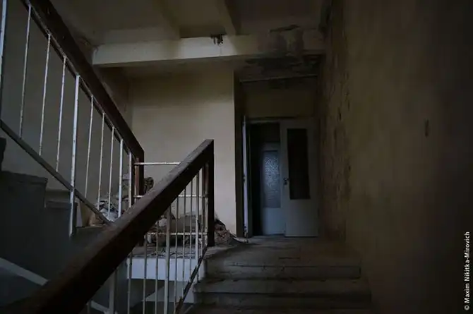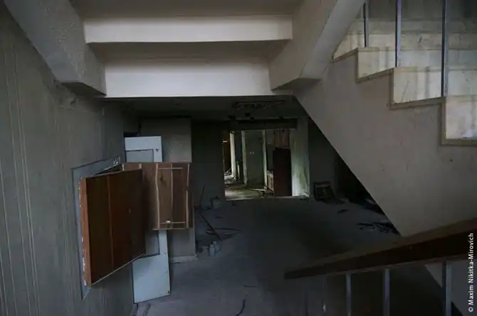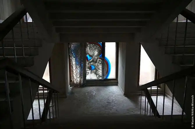 Лестничный пролет в середине здания. Виды остатки типичного советского декора (какие-то волнистые висюльки, имитирующие шторы) и граффити, оставленные малолетними «сталкерами» снаружи здания.