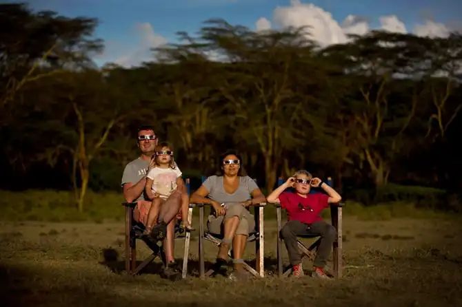 Семья туристов из Бельгии следит за солнечным затмением в Кении.