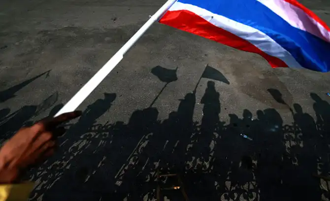Национальный флаг Таиланда реет над оградой Дома Правительства в Бангкоке, где недавно прошли массовые антиправительственные выступления.