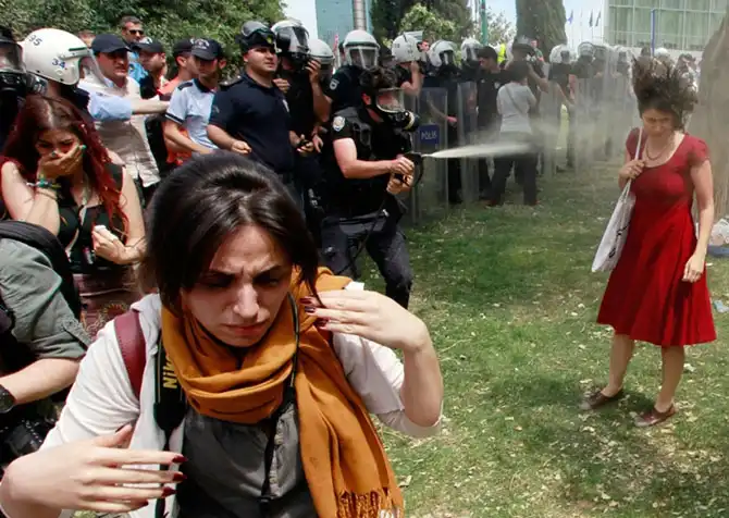 Турецкие полицейские применяют слезоточивый газ во время разгона мирной демонстрации протестующей против вырубки деревьев на площади Таксим в Стамбуле.