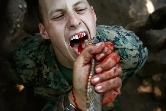 Морпех США пьет кровь кобры во время занятиях по выживанию в джунглях, которые проходили в рамках военных учений “Cobra Gold 2013″. Военная база в Чонбури, Таиланд.