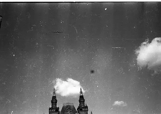 А посмотрите наверх! Летят самолёты! К сожалению, какие не до конца понятно. Как известно в 1952 году будет крушение двух новейших тактических бомбардировщиков и воздушную часть запретят.