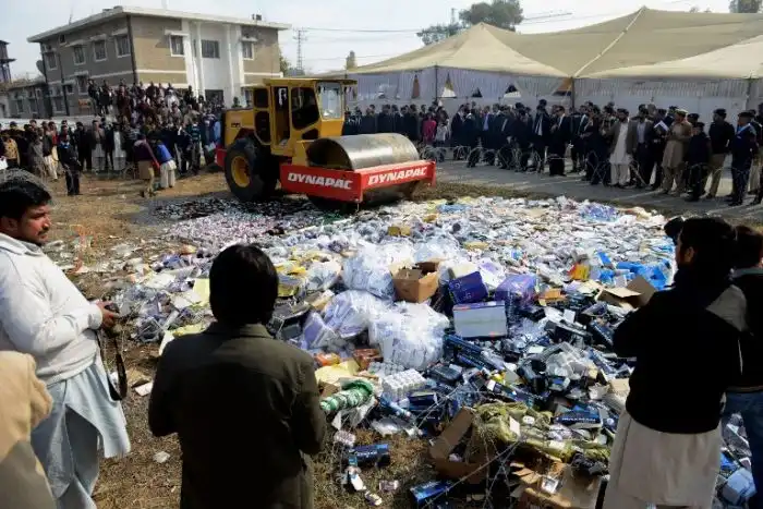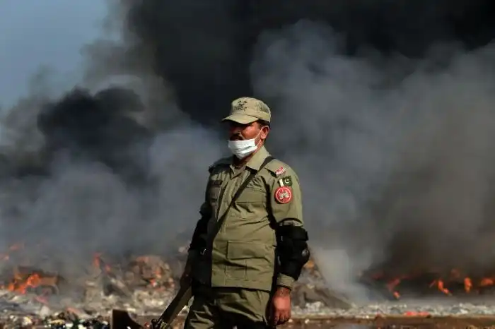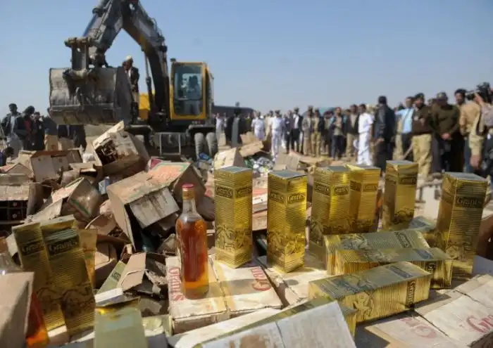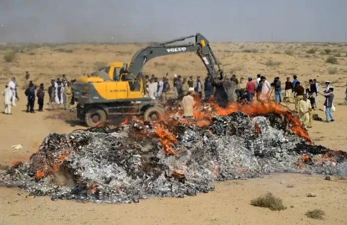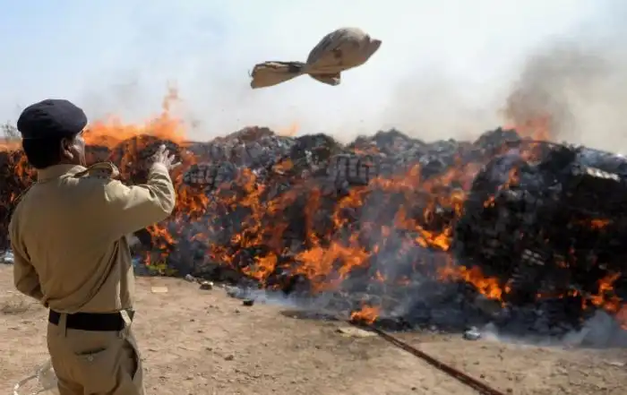 На протяжении целого года полицейские Пакистана изымают запрещённые вещи , спиртные напитки, наркотики из рук нарушителей. А потом наступает день, когда всё приходится сжигать на большом костре.