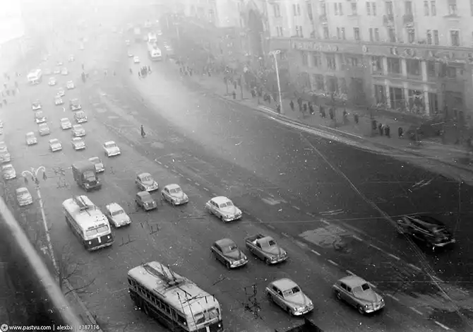 1954 год. На Красной площади еще было движение транспорта свободное.