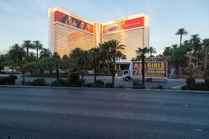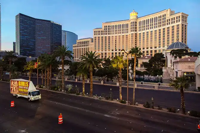 Проституция в Вегасе вроде как официально разрешена. Так что несмотря на отсутствие людей по улицам рано-рано утром уже курсируют вот такие рекламные щиты на машинах.