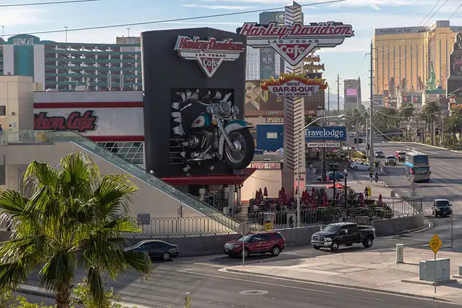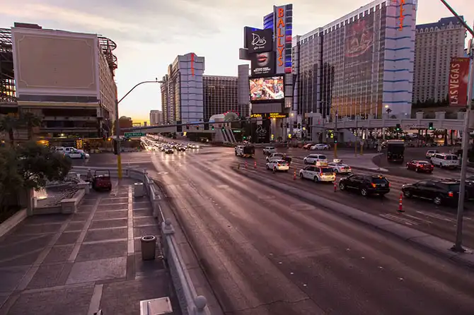 Утром на улицах – несколько меньше и машин, обычно-то на бульваре – пробки. Справа – отель и казино Ballys. На момент открытия в 1973-м году – это был самый большой отель в мире. Был построен пришедшей тогда в Вегас мега-корпорацией MGM (по сути дела положившей конец владычеству организованной преступности в Вегасе). В истории отеля – его уничтожение пожаром в 1980-м (тогда погибло 85 гостей), полная перестройка и многократный переход из рук в руки. В настоящее время отелем владеет корпорация «Цезарь Энтертэйнмент».