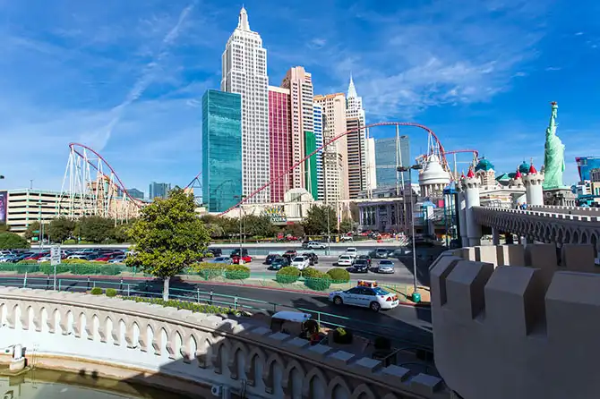 Американские горки вокруг – это т.н. Roller Coaster, известное развлечение на Стрипе. Когда гуляешь вокруг – постоянно слышишь крики оттуда, там вагончики не просто двигаются вверх-вниз, они описывают мертвую петлю, переворачиваются вокруг собственной оси и т.п. Скорость там достигает 108 км в час, а перепад высот – почти полторы сотни метров.