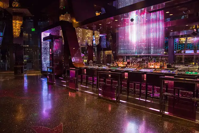 В барах уже пусто, нет ни барменов, ни выпивающих-играющих. Как видите, в баре стойка совмещена с игральными автоматами. Это бар отеля Космополитэн. И девушки, что обычно танцует слева, где светится прямоугольник – тоже нет. Кстати, посетителя бара ее не видят, девушка танцует для привлечения проходящих мимо.