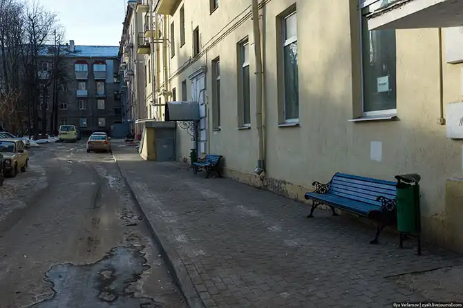 Даже во дворе на тротуаре будет лежать плитка и стоять ажурная лавочка.