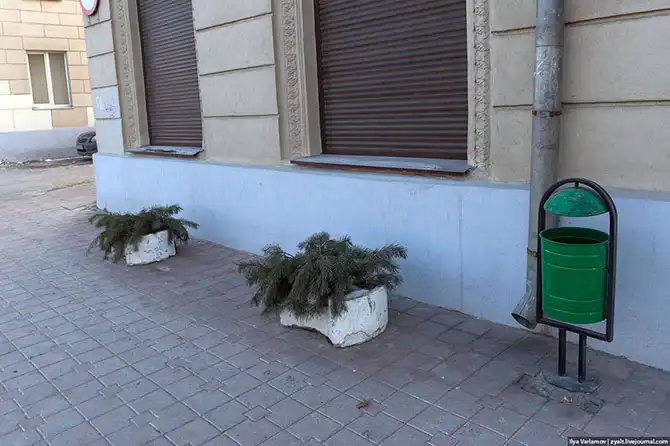 Недавно император Белоруссии издал указ, что в честь Нового года все должны украсить входы в магазины сосновыми ветками. И действительно, весь город в этих сосновых ветках.