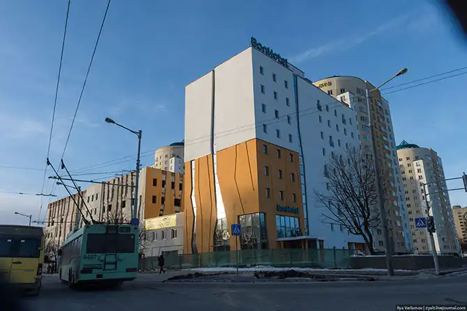 Какой-то отель. Для Минска сносная архитектура. На четверочку. Еще здесь строят очень крутое здание отеля Кемпински. Местные ругаются, что он какой-то там вид перекрывает. Я посмотрел проект – очень круто. Поскорей бы достроили, приеду специально, чтобы снять его.