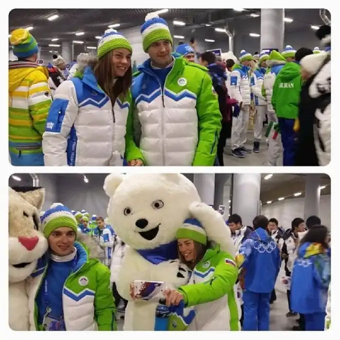 Спортсмены фотографируются с талисманами Олимпиады. Словения.
