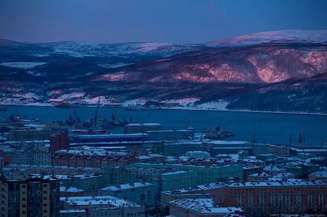 На всю нашу поездку было запланировано семь дней вместе с дорогой. Главную задачу — поймать сияние — мы выполнили за две ночи. Оставалось время на Мурманск и Хибины. Вид на город с заброшенной позиции ПВО на Солнечной горе.
