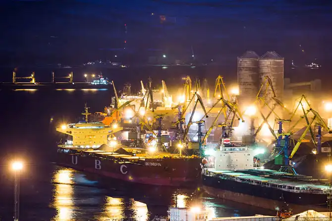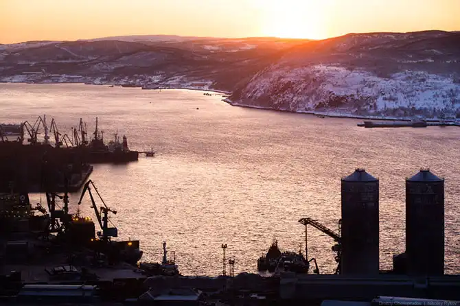 Угольный терминал порта. Из-за ежедневной перегрузки угля, белый снег на сопке Зеленого мыса всегда серый. Как в Прокопьевске.