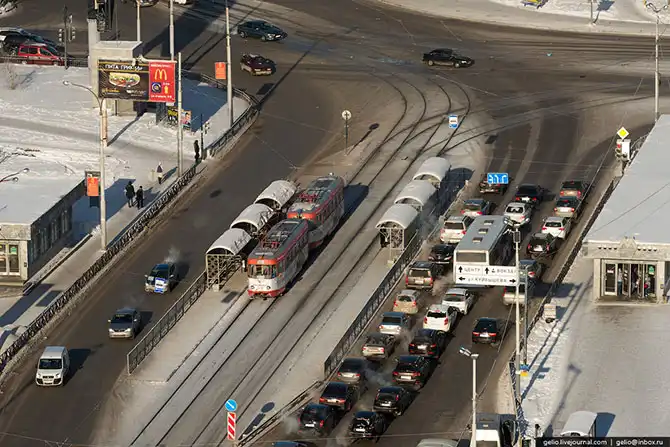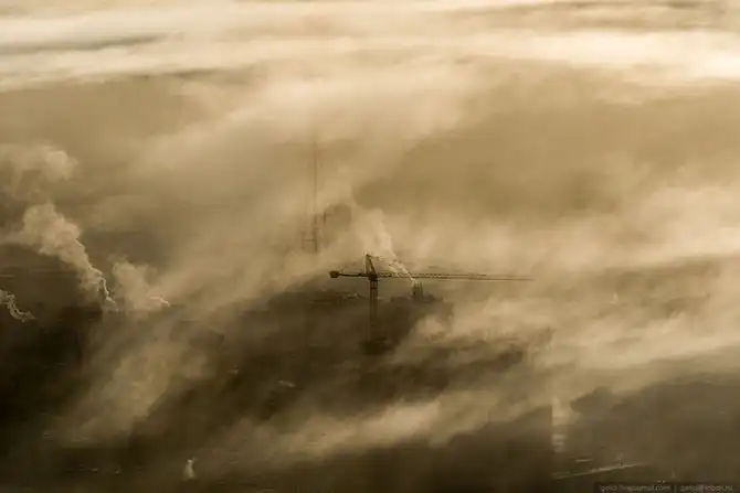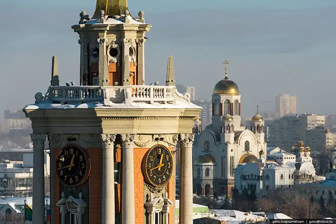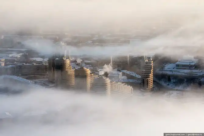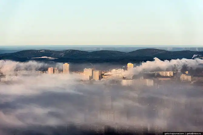 Екатеринбург расположен на Среднем Урале, в глуби континента, поэтому для него характерны довольно суровые зимы. По моим ощущениям, холод здесь переносится тяжелее, чем в Сибири. В те дни, когда я снимал эти фотографии на улице было до -38 градусов. На некоторых кадрах видно утреннюю морозную дымку, которая накрывала целые районы города, а сквозь неё виднелись только несколько небоскребов.