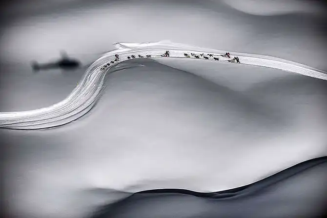 18 января 2013 года. Гонка на собачьих упряжках, вид сверху, Межев, Франция.