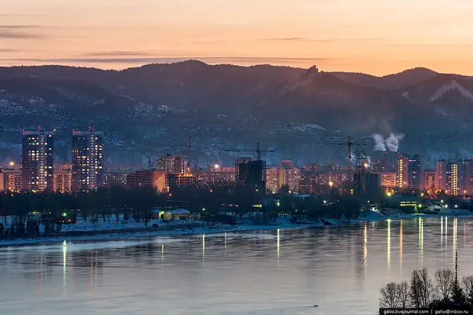 Красноярск – административный центр Красноярского края, центр Восточно-Сибирского экономического района, является одним из крупнейших городов Сибири с населением более 1 млн. жителей. Красноярску повезло с природой – он расположен в живописном месте, на берегах реки Енисей, в котловине, образованной Восточными Саянами. В морозы в Красноярске можно увидеть очень красивое явление – Енисей, который не замерзает в черте города, начинает «парить». Именно поэтому практически все точки съемки в репортаже про зимний Красноярск были привязаны к реке.