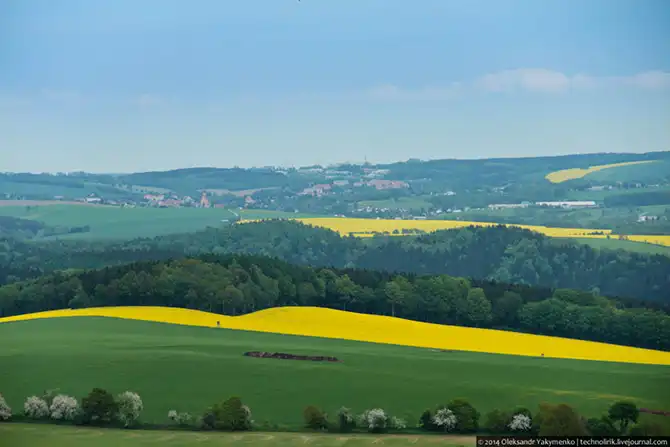 Желтое пятно – цветущий рапс, одна из самых распространенных сельскохозяйственных культур в Саксонии. По крайней мере, она видится такой из окон поезда, когда рапсовые поля мелькают в окне с поразительной частотой.