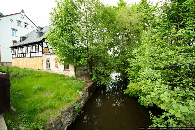 Придя на станцию и отметив, что до следующего поезда еще полчаса, я решил прогуляться по деревушке Erdmannsdorf. На фото речка Zschopau, вдоль которой проходит маршрут поезда Erzgebirgebahn. Вначале я даже думал назвать эту мини-серию постов «Вдоль русла Жопау», но подумал, что такое название может быть не понято читателями, и назвал серию «Сказочная Саксония».