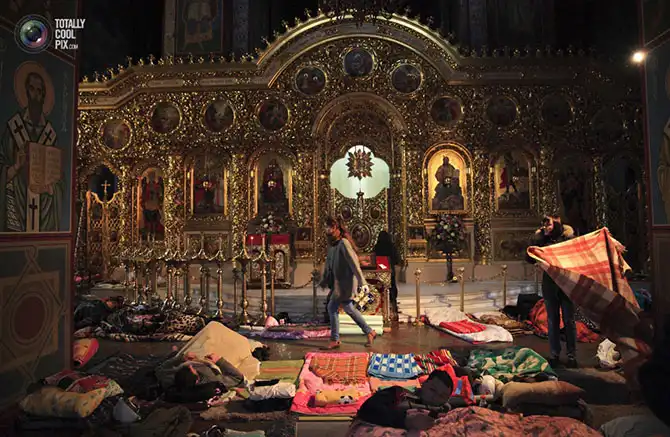 Протестующие в отдыхают в Михайловском соборе в Киеве.