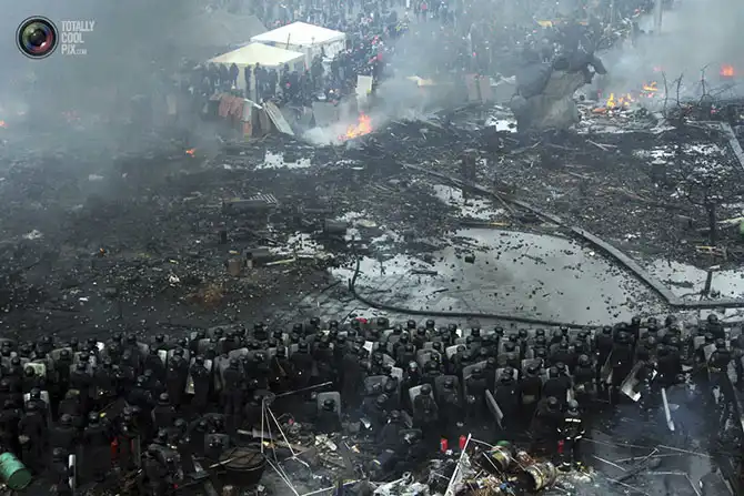 Женщина прячется за щитом сотрудника внутренних войск во время столкновений в Киеве.