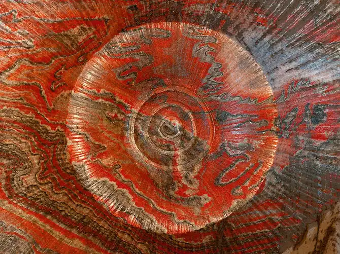 Круг диаметром пять метров «выгравировал» в сильвинитовой породе комбайн «Урал». Красный цвет придает породе калийная соль (хлорид калия), белый — обычная соль, черный — примеси глины и других осадочных пород.