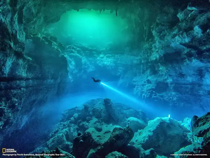 Дайвер исследует сенот в окрестностях Тулума — древнего города майя на полуострове Юкатан, Мексика.