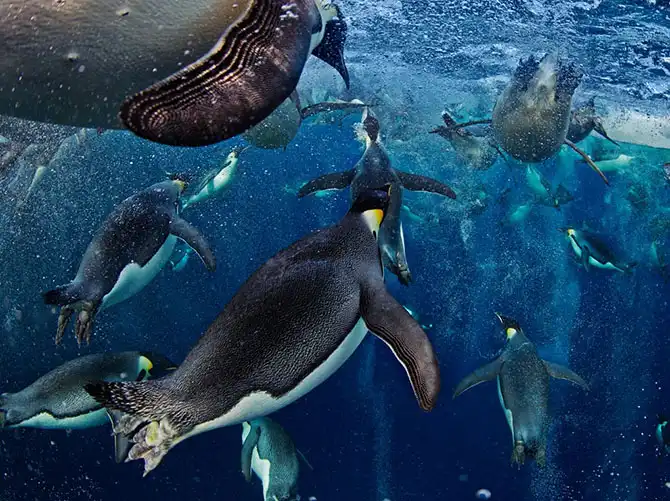 «Похоже, эти пингвины никогда не видели человека в воде, — говорит фотограф Пол Никлен. — Но им хватило пары секунд, чтобы понять, что я не представляю для них опасности. Они спокойно плавали и позволяли мне находиться рядом».