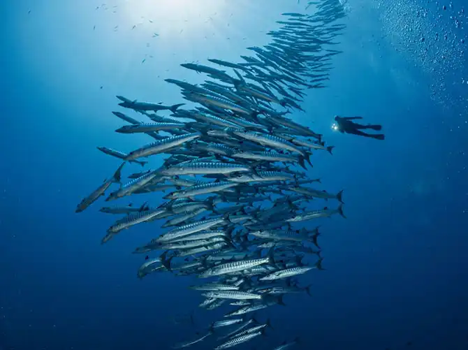 Двадцатиметровая башня из барракуд выстроилась рядом с морским биологом Дженнифер Хейз — женой и помощницей фотографа Дубиле.