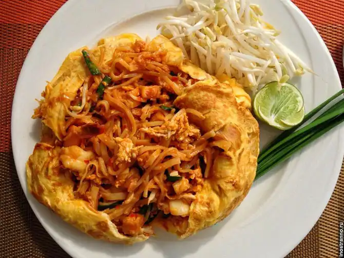 Пожалуй, это самое распространенное блюдо в тайской кухне и необыкновенно вкусное. Пад Тай всегда есть в меню любого ресторана на любом тайском курорте, а также у торговцев уличной еды. Пад Тай – жареная со специальным соусом рисовая лапша с курицей, мясом или морепродуктами. Подается с измельченным арахисом, ростками сои, зеленым луком и долькой лайма.