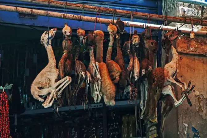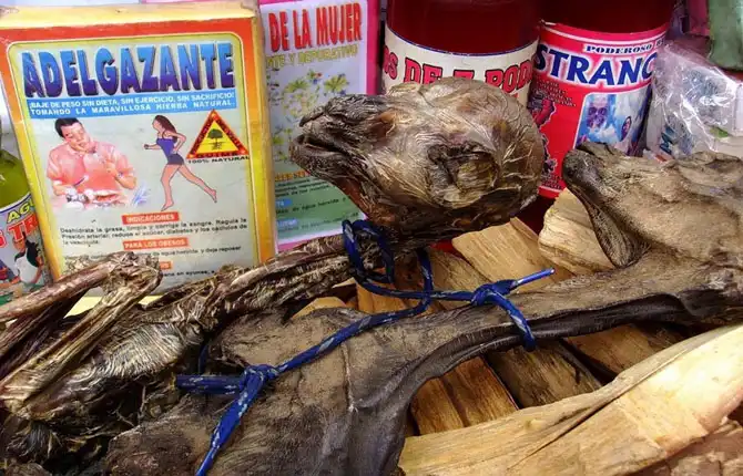 Особого внимания заслуживают мумифицированные останки животных или разделанные тушки зверьков, вроде высушенных жаб или летучих мышей, и, конечно же, зародышей лам – их продают от $2 за штуку. Здесь же, кстати, можно приобрести свежие листья коки, без которых местные оккультисты буквально жить не могут.