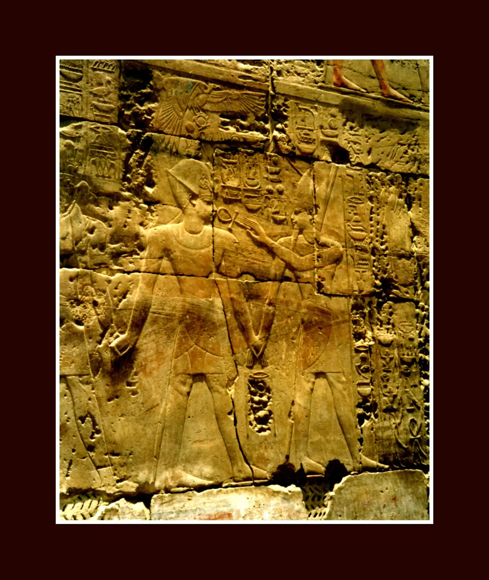 Он втащил меня в комнатку с колоннами без крыши, залитую солнцем и, как маленького ребенка, двумя чуть подрагивающими от радостного возбуждения руками, поставил в центр комнаты. Потом, все приговаривая заветное слово, он крутанул меня пару раз кругом, и я оказался лицом к одной из стен, на которой под отвесно падающими лучами солнца рельефно выступила самая настоящая египетская корова с длинными лирообразными рогами.