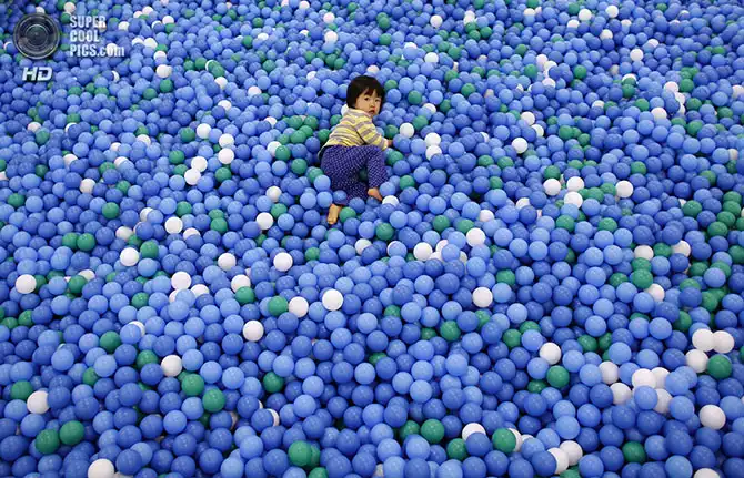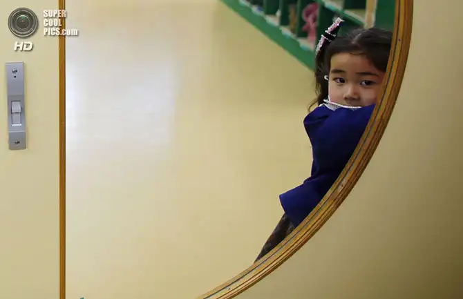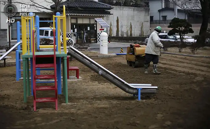2-летняя Нао Ватанабе играет на крытой детской площадке. Ей, как и другим детям в возрасте до трёх лет, разрешают находиться на воздухе не больше 15 минут в день из опасений радиоактивного заражения.