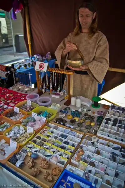 Дядечка заставляет звучать поющую чашу. А вот эти суровые таблички "Не лапать" меня всегда очень раздражают - как можно не пощупать товар руками на рынке???