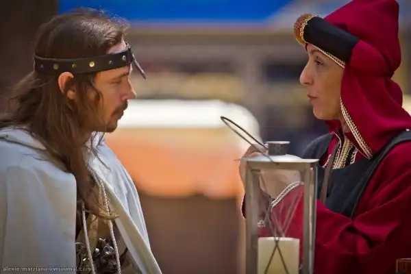 Рыцарь в накидке о чем-то мило беседует с восточной дамой (мавр?)