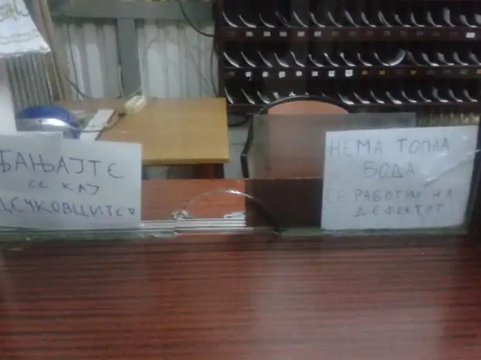 Приемная. На правой бумажке написано «Горячей воды нет. Проблема будет решена». (Когда?)