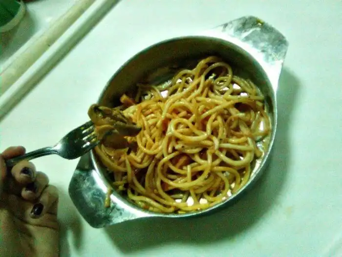 Макароны с сосиской (хорошо зажарена, чтобы нельзя было понять её исходное состояние)