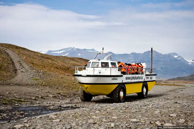 Большинство туристов катаются по Ледниковой лагуне на вот таких амфибиях. Стоимость удовольствия — 20 евро с носа. Амфибия отплывает примерно на километр и возвращается обратно. По дороге вам на нескольких языках расскажут все, что вы хотели знать о Лагуне, а напоследок вручат небольшой кусочек льда на память.